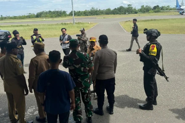 Boven Digoel – Personel Den Gegana Satbrimob Polda Papua BKO Polres Boven Digoel Melaksanakan Kegiatan Pengamanan Kedatangan Rombongan Komisi Nasional Hak Asasi Manusia (Komnas HAM) Dalam Rangka Kunjungan Kerja Pasca Insiden Penembakan Terhadap Pilot Dan Co-Pilot Pesawat Smart Air PK-SNR Oleh OTK Di Bandara Koroway Batu, Kabupaten Boven Digoel. Pengamanan dilaksanakan secara ketat dan terukur…